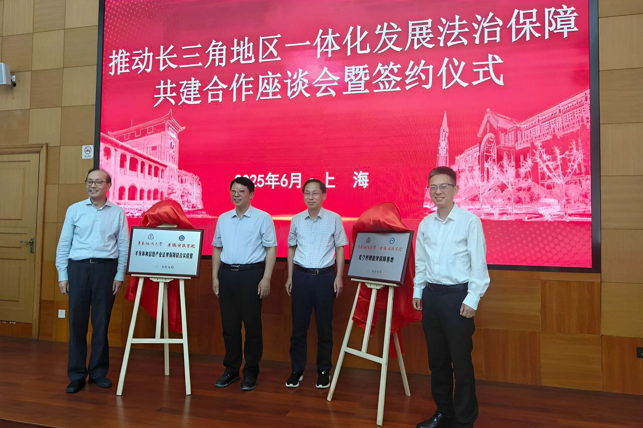 会上,李升和、叶青、吴磊代表三方签署《长三角地区一体化发展法治保障共建合作框架协议》,标志着三方正式建立全方位、多层次的法治保障合作机制。随后,李升和、王玉和与叶青、吴磊共同为“低空经济法律保障基地”“半导体和信息产业法律保障联合实验室”揭牌。李升和为特聘教授、兼职教授颁发聘书。(特约通讯员:高晓宁 摄影:徐靖宇 审核:牛永辉 李晓东)