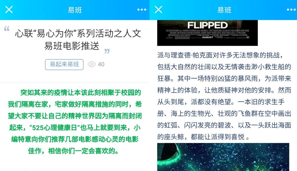其次,人文学院心理委员联合会成员为大家推荐了五部电影,希望大家不要让自己的精神世界因为疫情的隔离而封闭起来。“有的人浅薄,有的人金玉其表,败絮其中。有一天你会遇到一个彩虹般绚烂的人,当你遇到这个人后,会觉得其他人都只是浮云而已。”《怦然心动》这部影片为我们描述了青春期中男孩女孩之间有趣的战争。斯人若彩虹,遇上方知有。“曾发生过的事情不可能忘记,只不过是你想不起来罢了”。《千与千寻》讲述的是千寻与父母在搬家途中,发生意外,父母变成了动物。在救爸爸妈妈期间遇到白龙,经历了许多事情之后,救出了爸爸妈妈和白龙。孩子终将长大,在面对冒着黑烟,被湿气,欲望笼罩的大浴场般的社会时,希望大家能鼓起勇气,不忘初心,收获美好。每个人心中都有一个瑰丽壮观,无人能及的冒险之旅。《少年派的奇幻漂流》讲述的是少年派遇到海难,家人全部丧生,他漂流了227天后获得重生的故事。如果我们在人生中体验的每一次转变,都让我们在生活中走得更远,那么,我们就真正的体验到了生活想让我们体验的东西。