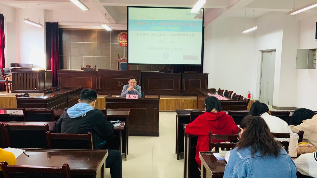 11月20日上午,安徽知秋律师事务所副主任王欣围绕“建设工程竣工与验收中的法律问题”进行“以案说法”。活动由模拟法庭主任宣刚主持。