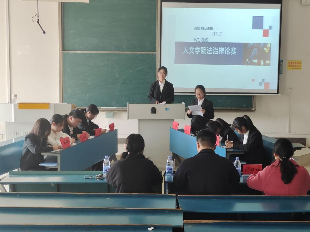 为丰富学生校园文化生活,培养学生的思辨能力和语言表达能力,人文学院于11月29日下午14:00在新知楼A208教室举行新生辩论赛。卢书好、闫祖瑶、姚雯应邀担任本次比赛的评委,人文学院新生组成正反双方就“法律应该限制人的自由还是保护”展开激烈辩论。比赛由方囝囡主持。