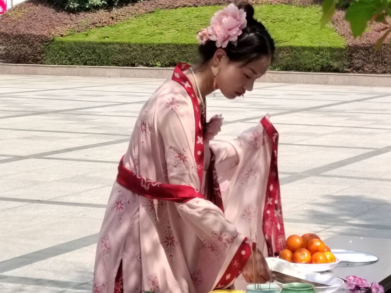 上午十时,春阳复暖,在活动人员的精心筹备下,活动于十点二十分正式开始。盈香满袖,十二位绮罗珠履的“花神”,手执团扇与“献官”缓步而来,同“赞者”和“侍从”一齐祭拜花神,分食福胙,祈花神降福,佑作物茂盛。为延袭旧俗,校国风汉服社与书美协会还分别举行了“飞花令”和“投壶”比赛,效仿夕日“郊游雅宴”、“士庶游玩”的盛况。