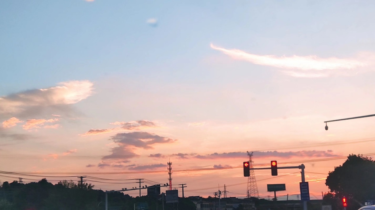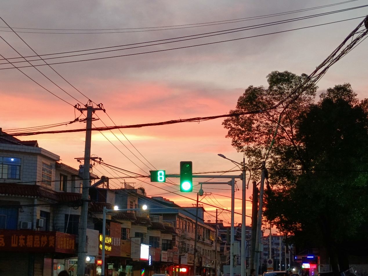 作品介绍:绿灯,街道,房屋,电线任凭心情分割了天空,晚霞指引着路人归家,天空被装扮成了混合染料的调色盘,神笔马良也调不出的颜色让人惊艳又热烈。