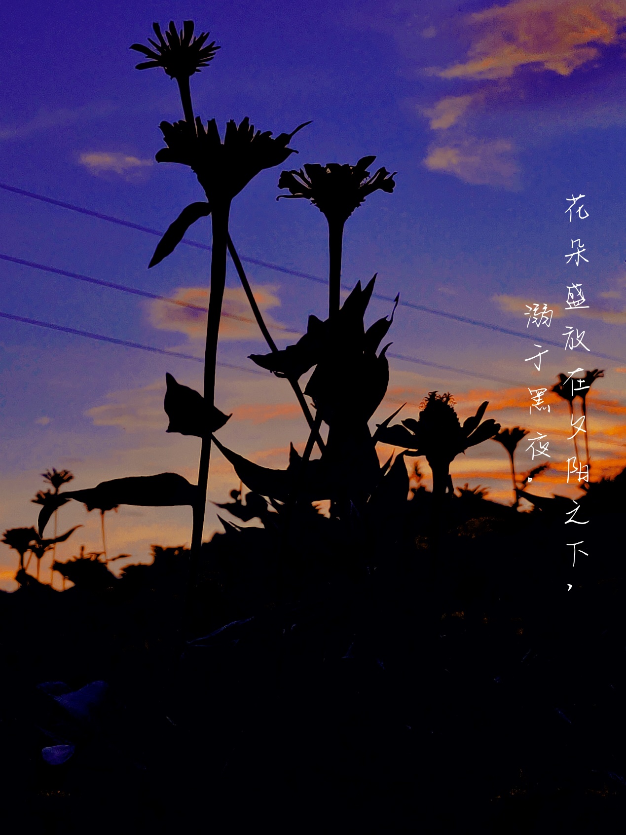 作品介绍:散步于河边的花圃,红日将落于西山,暮色将至。我坐在日落里,望晚风衔热意远去,叹花朵向日盛开,挺直腰杆,骄傲又美丽地立于夕阳里。风轻轻,云朵朵,抬眼便是风情万种的故乡落日与热烈浪漫之花。