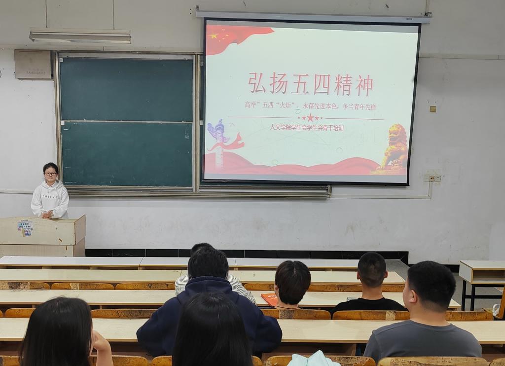 为弘扬五四精神,彰显时代风采和青春价值,传递青春正能量。5月4日,人文学院学生会于求知楼A103开展五四青年志愿者红色宣讲活动暨学生干部培训活动,人文学院学生会全体成员参加,会议由人文学院辅导员徐琦琦主持。