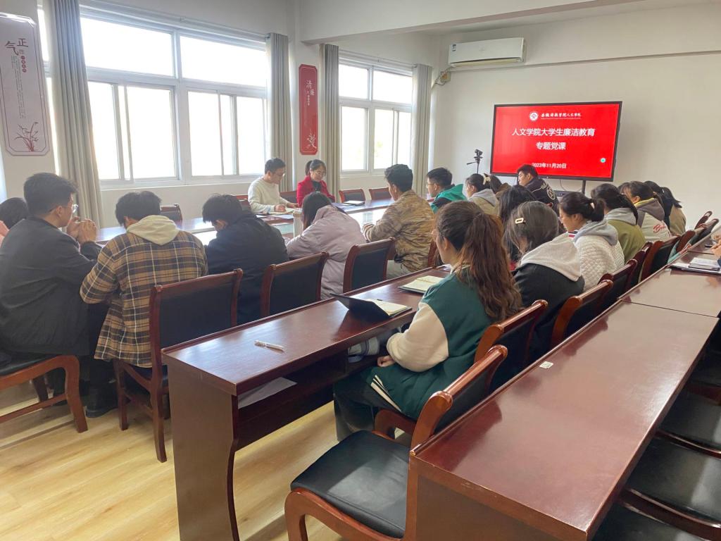 为深入推进大学生廉洁文化教育,11月20日,人文学院在学知楼324会议室举办大学生廉洁教育专题党课活动,专题党课由学院党委副书记、纪委书记李沙娜主讲,法学专业学生党支部全体党员参加。