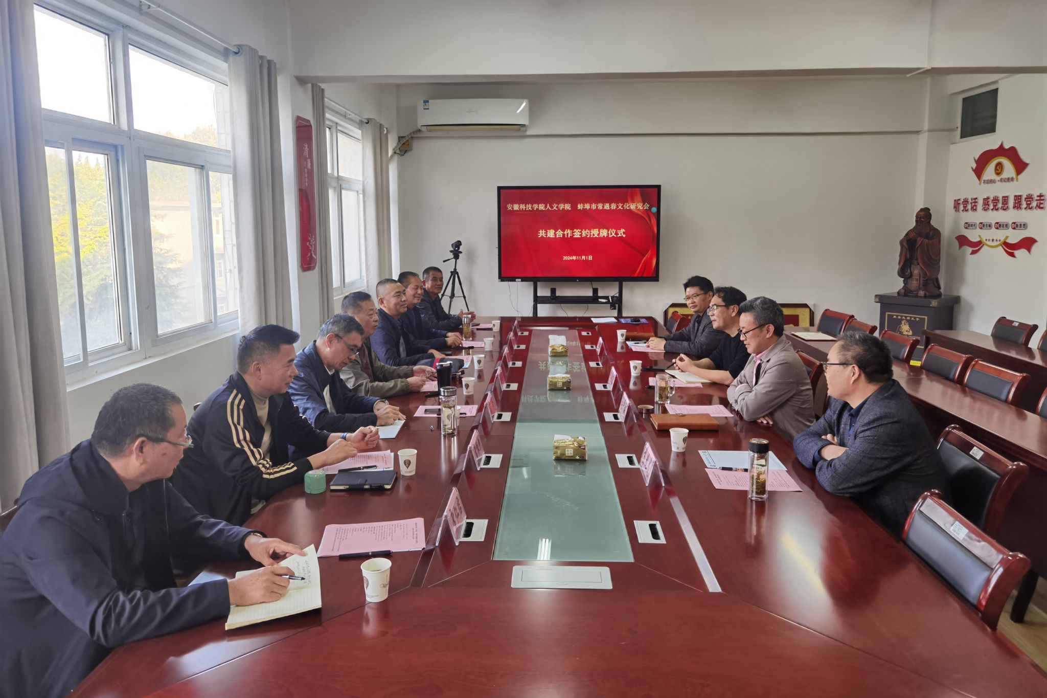 11月1日下午,蚌埠市常遇春文化研究会会长常跃武、常务副会长常永、顾问常平等一行7人来校签署共建合作协议;人文学院党委副书记、院长李晓东,正处级组织员张严政,副院长牛永辉,中文系主任苏兆龙出席仪式。仪式由张严政主持。