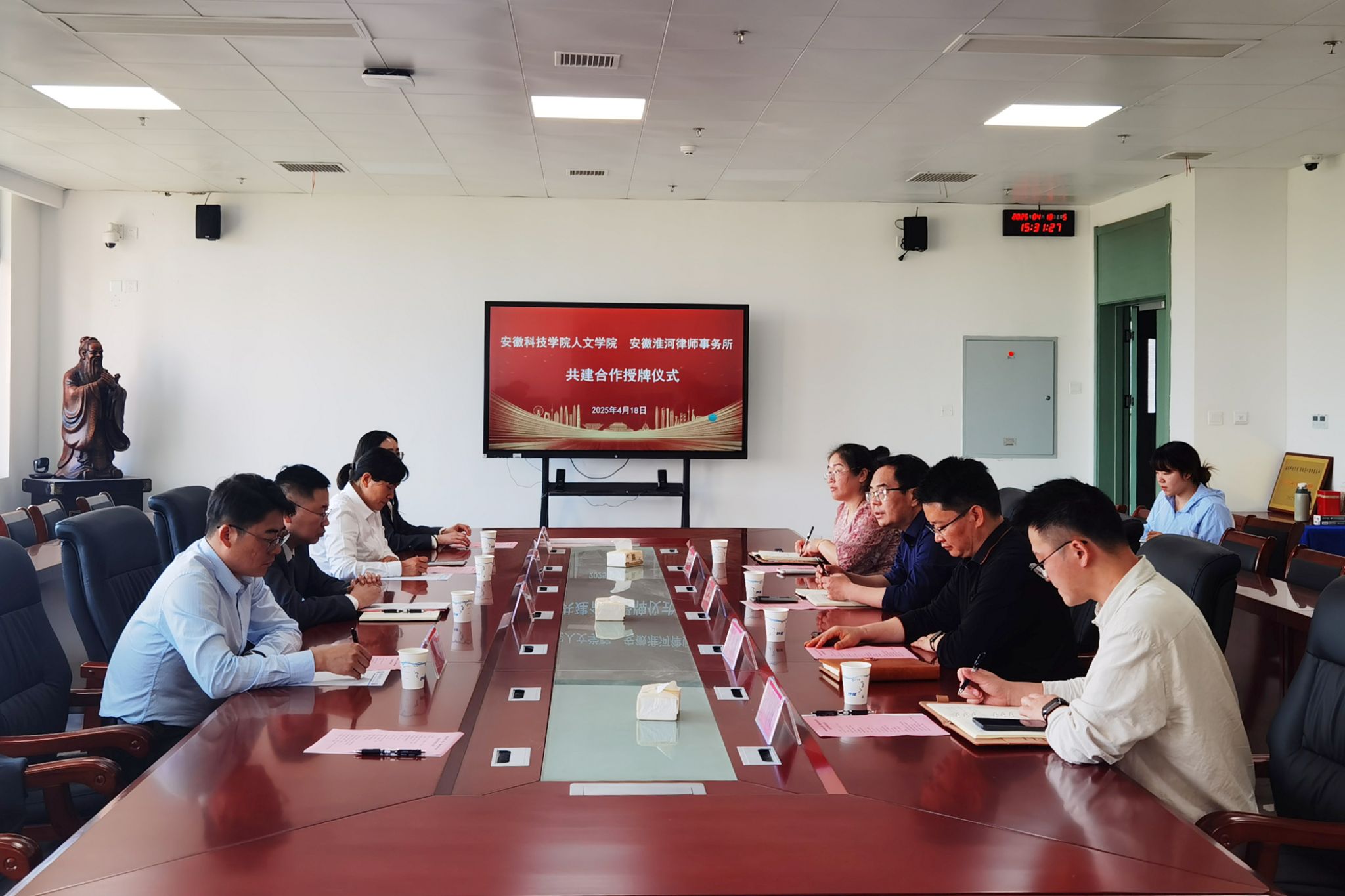 4月18日下午,人文学院与安徽淮河律师事务所,在人文学院313会议室,举行共建合作授牌仪式。安徽淮河律师事务所主任尹现波,党支部书记李加文,合伙人张小曼、叶磊,人文学院党委书记、院长李晓东,副院长牛永辉,党委副书记李沙娜,党政办副主任方明旺出席。仪式由牛永辉主持。