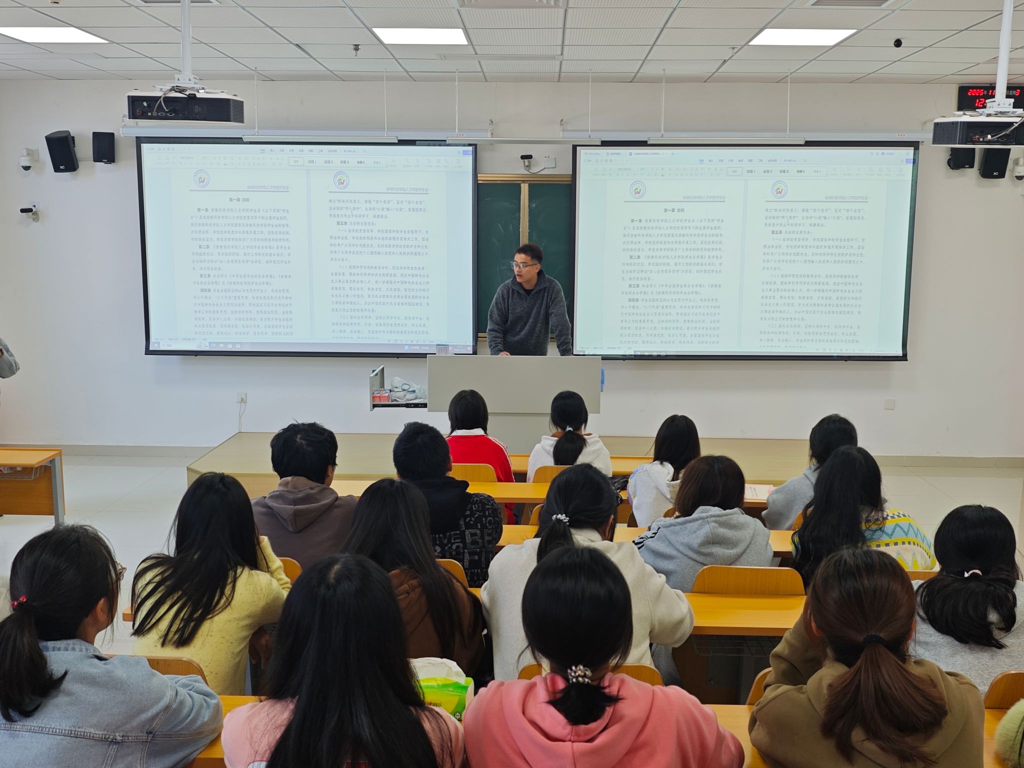 会议期间,王浩童对修订后的《人文学院学生会章程》及团支部工作条例进行了宣讲与解读,并就学生会部门职能划分、成员留任等相关事宜作了详细说明。会议强调,学生会是服务广大同学的重要组织,希望全体成员锤炼务实作风,主动倾听同学诉求,不断提升综合能力,努力成长为善沟通、能奉献、有担当的新时代学生骨干,切实发挥学生组织的桥梁纽带作用。