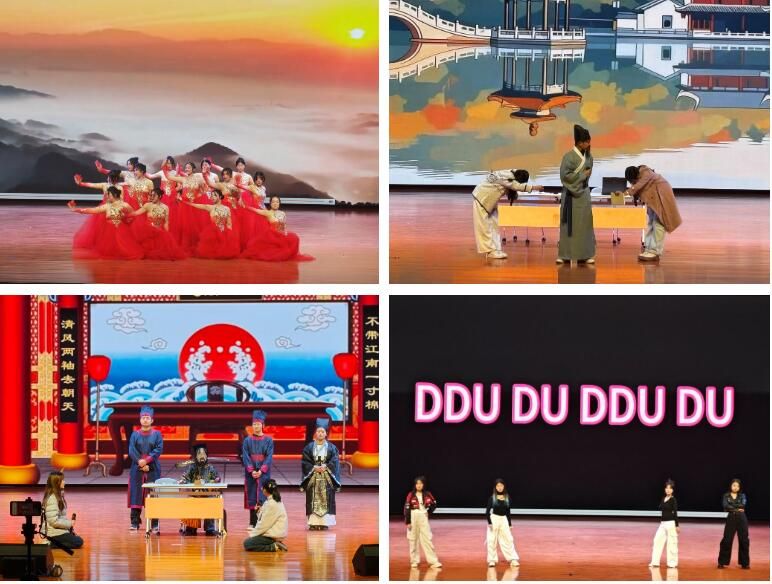 文艺晚会环节精彩纷呈,为现场观众呈现了一场兼具思想性、艺术性与观赏性的文化盛宴。开场舞《ddu du ddu du》以活力四射的节奏、舒展奔放的舞姿瞬间点燃全场氛围;法律小品《包大人断案“量子记忆贴”》巧妙融合法学知识与趣味剧情,将法学特色与舞台艺术完美结合,引得现场笑声与掌声不断;歌曲串烧以婉转悠扬的歌声传递青春心语,细腻情感直抵人心;话剧《盼蜓归期》凭借演员们细腻生动的演绎,深刻诠释故事内涵,引发观众强烈情感共鸣;舞蹈《What is love》节奏轻快、风格活泼,灵动舞步尽显青年学子的蓬勃朝气;舞台剧《琅琊山下的跨世对话》以独特的叙事视角搭建时空桥梁,带领观众沉浸式感受故事魅力;舞蹈《万疆》则以大气磅礴的编排、舒展优美的舞姿,生动诠释了家国情怀的厚重底蕴与温暖力量;教师朗诵《弦歌不辍七十五载,人文薪火永相传》以深情激昂的语调、真挚饱满的情感,回望学院发展历程,展望人文未来愿景,为整场晚会画上圆满句号。