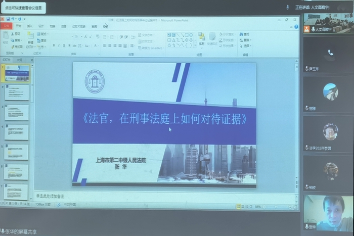 12月9日下午,人文学院在求知楼A204教室举办题为“法官,在刑事法庭上如何对待证据”的学术报告会。此次报告会由上海市第二中级人民法院三级高级法官张华主讲,人文学院副院长牛永辉主持,人文学院2020级法学全体同学,省内外部分律师代表和优秀毕业生线上参会。