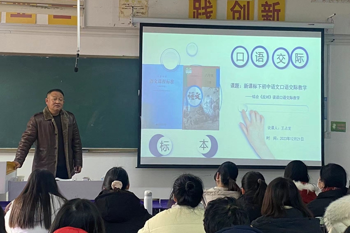 王占发老师以《新课标下初中语文口语交际教学》为题,以难讲、难备的口语交际教学作为主要内容,强调了新课标下口语交际的必要性,梳理了部编版教材口语交际的编排,分析了口语交际教学课堂现状及原因。高天红老师以《有趣、简单、高效—论初中语文教学艺术》为题,从培养学生兴趣、运用科学教学方法入手谈阅读理解教学和写作表达的教学要求,促进学生的语文学习有最大收获。汪灵芝老师以《初中语文阅读教学专题探究》为题,着重谈了初中语文阅读教学策略及其典型题型的答题方法和技巧思考,并分享了从教以来与学生相处的感悟和体会。