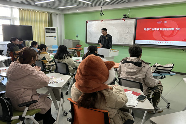 就业指导讲座上,校招负责人马先生简要分析了当前就业形势,并重点从职业认知、职业规划、求职准备等方面开展就业指导讲座,引导同学们在注重职业规划、注重专业学习、注重知识积淀的同时,还需提升个人综合素质及求职技能,更新就业观念,不骄不躁、不等不靠,尽快成功走上工作岗位。他还详细介绍了海亮明康汇生态农业集团的企业文化及发展历程、业务范围、技术优势、岗位需求、薪资待遇等方面情况。提问互动环节,对同学们关心关注的问题,进行了耐心细致的解答。