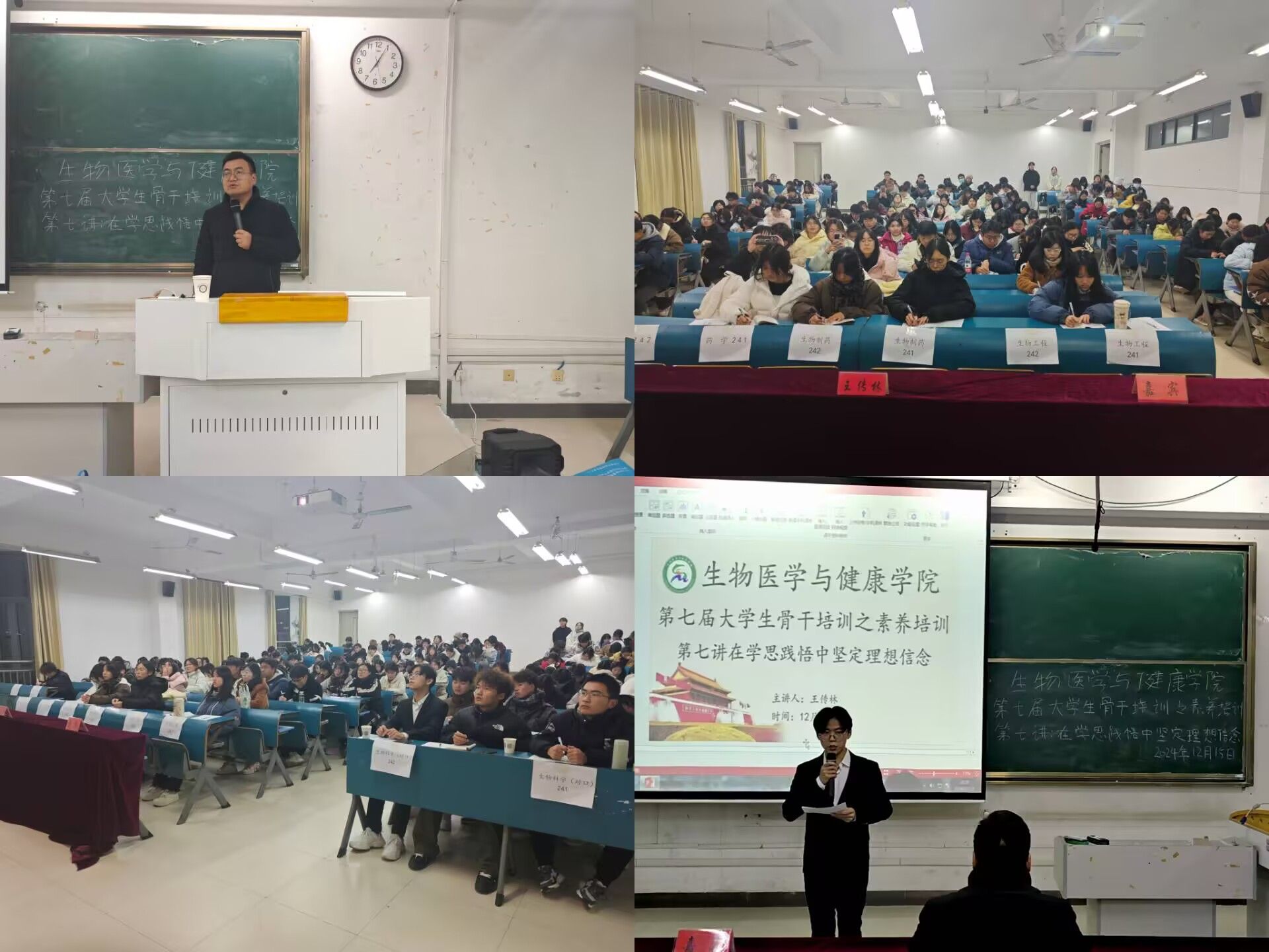 为加强学生理想信念教育,引导学生积极践行社会主义核心价值观,12月15日晚上,生物医学与健康学院在新知楼B304教室举办学生骨干培训之素养培训第七讲《在学思践悟中坚定理想信念》专题讲座。学院党委委员、党政办公室主任王传林担任主讲,讲座由学院团组负责人郑雷超主持。2024级各班级学生干部、学生会全体工作人员参加讲座。