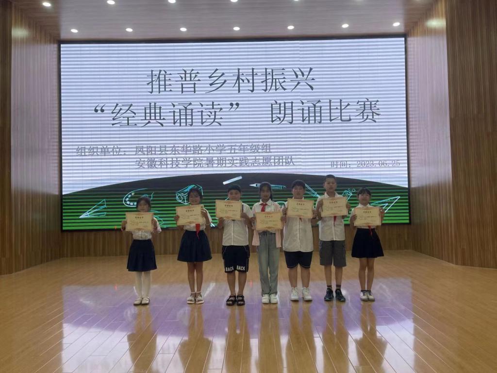为践行爱国主义教育,助力普通话推广任务。生命与健康科学学院“奉献暖人心”社会实践团队在指导老师姜毅、沈靓的指导下来到凤阳县府城镇东华路小学,自6月25日起,开展为期三天的以“阅读经典、诵读经典”为主题的社会实践活动。团队负责人张志通过与该校五年级组长进行沟通对接,开展了诵读经典朗诵比赛和读书方法分享交流会的活动,全体五年级同学参与并观看。