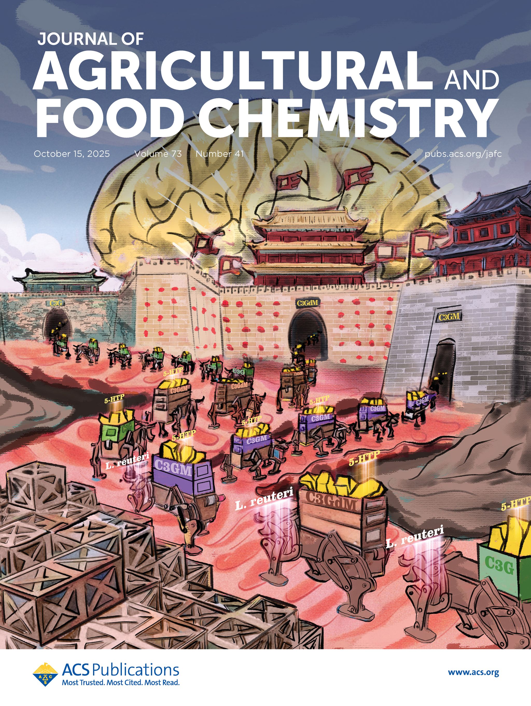 近日,我校食品科学与工程学院分子加工与精准营养实验室陈春旭副教授团队在美国化学学会期刊《Journal of Agricultural and Food Chemistry》(中科院一区TOP,IF 6.2)最新一期(2025,Volume 73, Issue 41)发表封面论文《Multi-Malonylation Enhances the Neuroprotection of Cyanidin-3-O-Glucoside by Promoting Gut-Derived 5-Hydroxytryptophan Production via Limosilactobacillus reuteri through the Gut-Brain Axis》。第一作者为李俊杰硕士,通讯作者为陈春旭副教授,安徽科技学院为第一署名单位。该文是陈春旭副教授团队近年来在Journal of Agricultural and Food Chemistry上发表的第5篇论文,也是该团队第2次登上该期刊的封面。