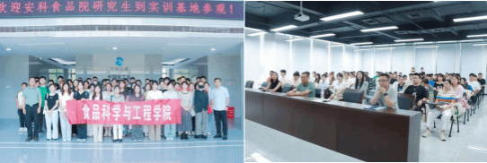走访活动安排紧凑而充实。同学们首先来到中轻合盛科技有限公司,在企业专业技术人员的引导下,重点参观了食品检验检测中心。工作人员详细讲解了从原料到成品的全程质量监控流程,以及微生物检测、营养成分分析和食品安全快速检测技术的实际应用。同学们近距离观摩了精密仪器的操作,并就检测标准、质量控制体系等与技术人员进行了深入交流,对食品检测的前沿技术和行业规范有了更直观和深刻的理解。随后,大家前往滁州盼盼食品有限公司, 参观了烘培产品生产线和我校与企业联合共建全谷物营养与高值化利用安徽省重点实验室, 进一步学习食品安全生产流程与企业创新管理模式。通过实地观摩与现场交流,同学们增强了对专业实践应用的直观认识,也激发了对未来学术研究与职业发展的浓厚兴趣。