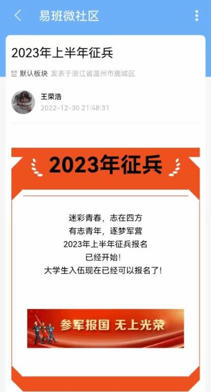 线上充分发挥易班平台作用,及时发布应征入伍最新消息及相关政策解读,营造了征兵宣传良好氛围,进一步激发适龄青年学生积极响应国家号召参军入伍,投身国防建设的热情。
