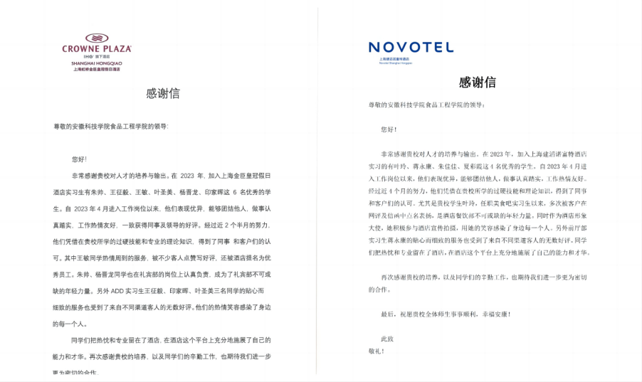 2023年暑期,食品工程学院顺利结束了2020级烹饪与营养教育专业学生的实习工作,其中,朱佳佳等十名同学以优异的实习表现受到了实习单位的高度认可,上海建滔诺富特酒店、上海金臣皇冠假日酒店分别向我院发来感谢信。