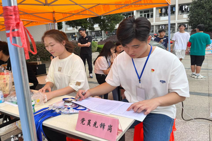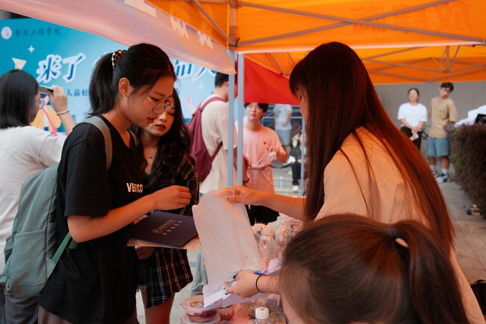 迎新活动现场,经过精心布置,处处彰显着热情与温暖。在学院西区报到点,学院简介、近三年学生参加学科竞赛情况(部分)一览表、优秀学子风采录等一字排开,充分展现了学院卓越的办学成绩、精湛的专业文化和斐然的育人成果。各项迎新流程标识温馨醒目,各主要报到环节也都设置了党员先锋岗,按比例安排共产党员和入党积极分子提供热心服务,从报到点至宿舍全流程帮助,让新生能在入学伊始就感受到学院的关怀,较快适应生活场景和个人角色转变。学院组织三个学科团队制作特色美食,印制学生管理制度手册,开展了“一见倾‘新’盲盒赠小‘食’”活动,并在迎新现场制作学院博士团队研发的特色冰粉、绿豆汤和风味香肠,供学生和家长前来品尝。此外,现场还开展了“‘食’‘新’实意——我与食院之初见”、“我爱食院”、“明信片载鼓励,新同学话共进”、“榜样引我前进”等特色活动,新生们纷纷表示:“看到这么多博士团队研发的新品,我就知道来对了!”一位家长说道:“我是一名医生,平时不怎么吃外面的甜点和小吃,但我相信学院博士团队对食物品质的把控和营养的搭配。”