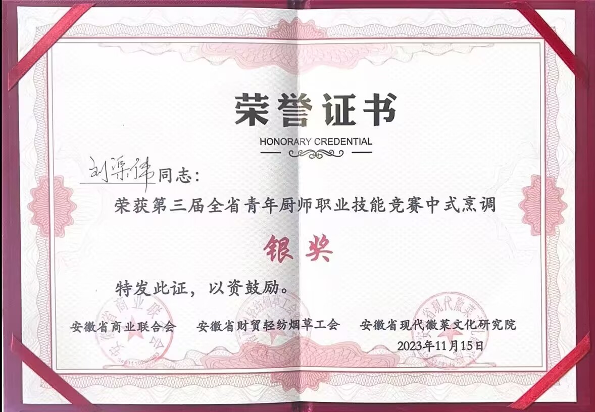 11月15日,以“建功十四五 奋进新征程”为主题的第三届全省青年厨师职业技能竞赛在安徽外经大厦酒店成功举办。本次竞赛由安徽省财贸轻纺烟草工会、安徽省商业联合会主办,安徽省现代徽菜文化研究院承办。经过激烈角逐,我校食品工程学院烹饪与营养教育222班本科生刘渠伟荣获中式烹调银奖。