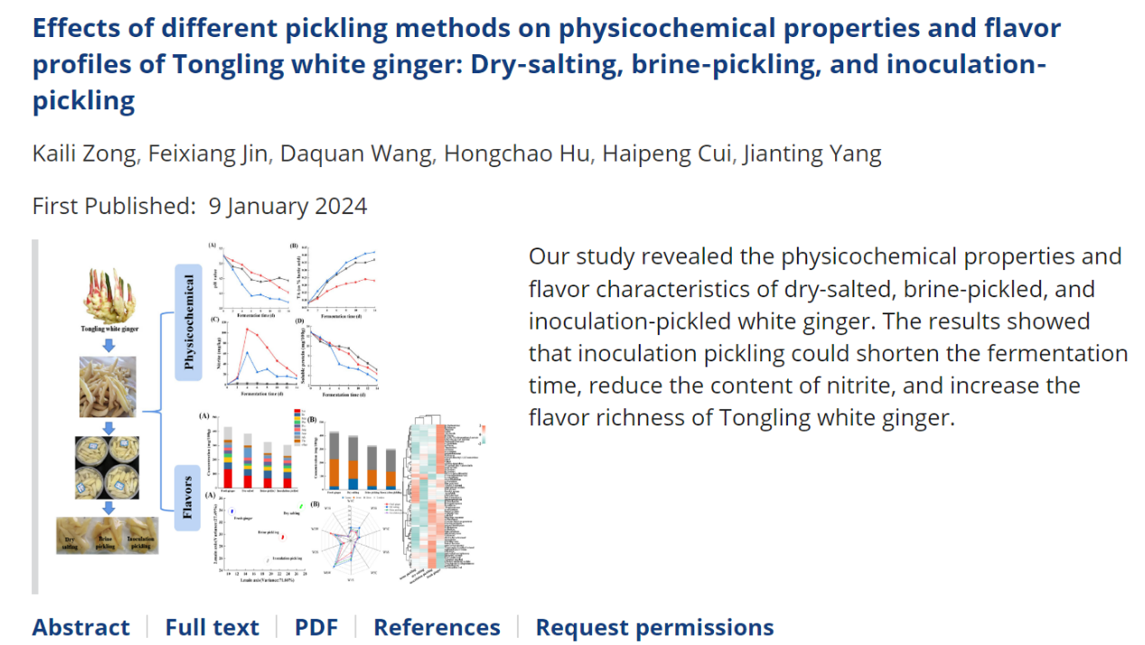 近日,我校果蔬精深加工与营养控制创新团队在农林科学领域二区期刊Food Science & Nutrition(IF=3.90)在线发表题为“Effects of different pickling methods on physicochemical properties and flavor profiles of Tongling white ginger: Dry‐salting, brine‐pickling, and inoculation‐pickling”的研究论文。2021级硕士研究生纵凯莉为第一作者,杨剑婷副教授为通讯作者,安徽科技学院为唯一完成单位。