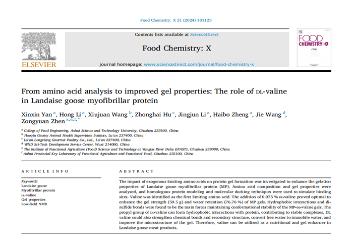 近期,我校食品工程学院动物源食品精深加工与营养团队在中国科学院农林科学领域一区TOP期刊Food Chemistry: X(IF=6.10)在线发表题为“From amino acid analysis to improved gel properties: The role of DL-valine in Landaise goose myofibrillar protein”的研究论文。食品工程学院2021级食品加工与安全领域硕士研究生燕鑫鑫为第一作者,甄宗圆副教授为通讯作者,安徽科技学院为第一完成单位。
