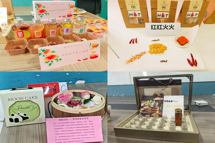 比赛现场,各参赛团队代表借助PPT汇报,通过实物展示等形式,全方位地向评委们呈现了其创意成果。汇报内容聚焦研发背景、原料创新、工艺流程、市场前景等维度展开,评委们也对产品进行了全面专业的评价与打分,为各团队的后续改进明确了方向。产品展示区域,“葛蜜玫韵——葛根蜂蜜花果糕”、“芝萃金油——灵芝三萜芝油”、“金玉良‘圆’——全谷物无麸质玉米汤圆”、“红红火火”、“康养司康”等特色产品依次摆放在展台上,各类产品包装独具匠心,吸引了校内众多同学前来观摩,现场人头攒动,气氛热烈,大家都对此次活动表现出了浓厚的兴趣。