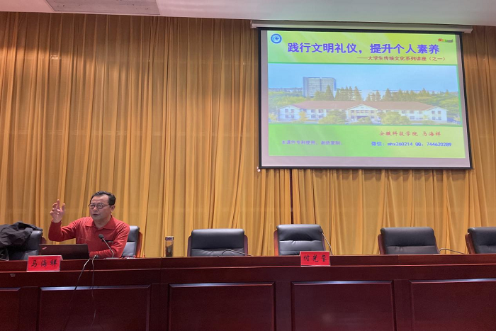 为传承弘扬中华优秀传统文化,提升大学生综合文化素养,丰富大学生的礼仪知识,培养大学生文明习惯,营造浓厚的学院文化氛围, 11月10日下午,食品工程学院于图书馆二楼报告厅举办了 2024 级新生文明礼仪专题讲座,人文学院退休教师马海祥副教授受邀担任主讲人,学院全体辅导员及新生聆听讲座。讲座由学院党委书记付光玺主持。
