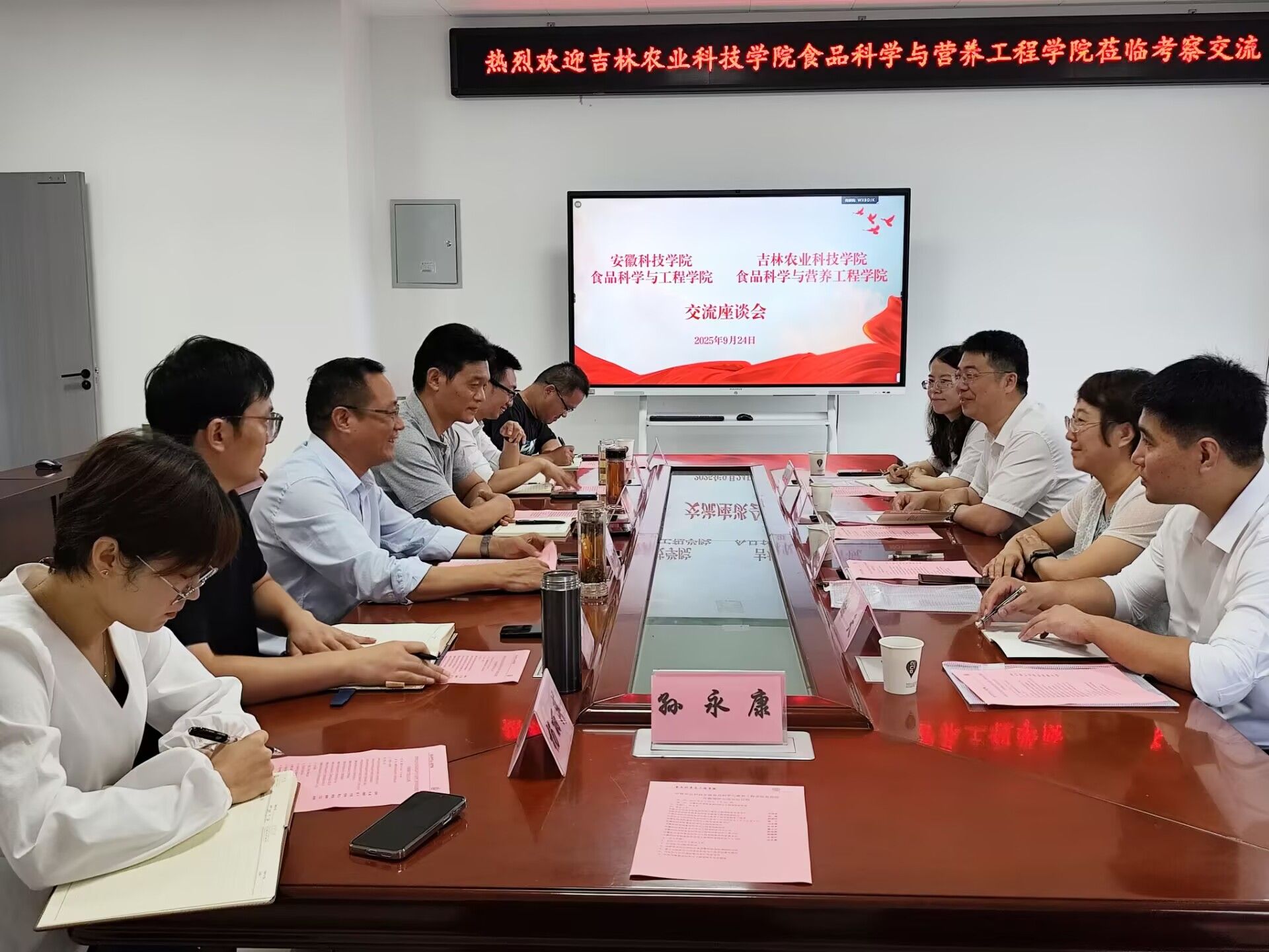 9 月 24 日上午,吉林农业科技学院食品科学与营养学院党总支书记吕闻明、副院长刘超等一行 4 人到访我校食品科学与工程学院开展调研交流。学院党政领导出席会议,各系室负责人参加会议,会议由院长杜传来主持。
