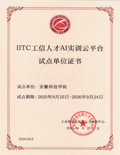 近日,从工业和信息化部人才交流中心传来喜讯,安徽科技学院成功入选“IITC 工信人才 AI 实训云平台”全国首批试点院校。此次入选,标志着我校在数字化教学改革方面迈出关键一步。
