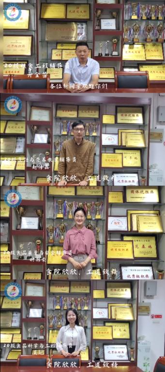 食品工程学院各专业辅导员也在寄语视频中为新生及家长送去了祝福!粮食工程专业辅导员开金苗在寄语视频中表达了自己对新生的极高期望,他说到:“民以食为天,不管是过去、现在还是未来,食品都是永恒的课题,希望你们从今天起,肩负祖国食品科学的未来,将来为人类食品科学事业贡献自己的力量”