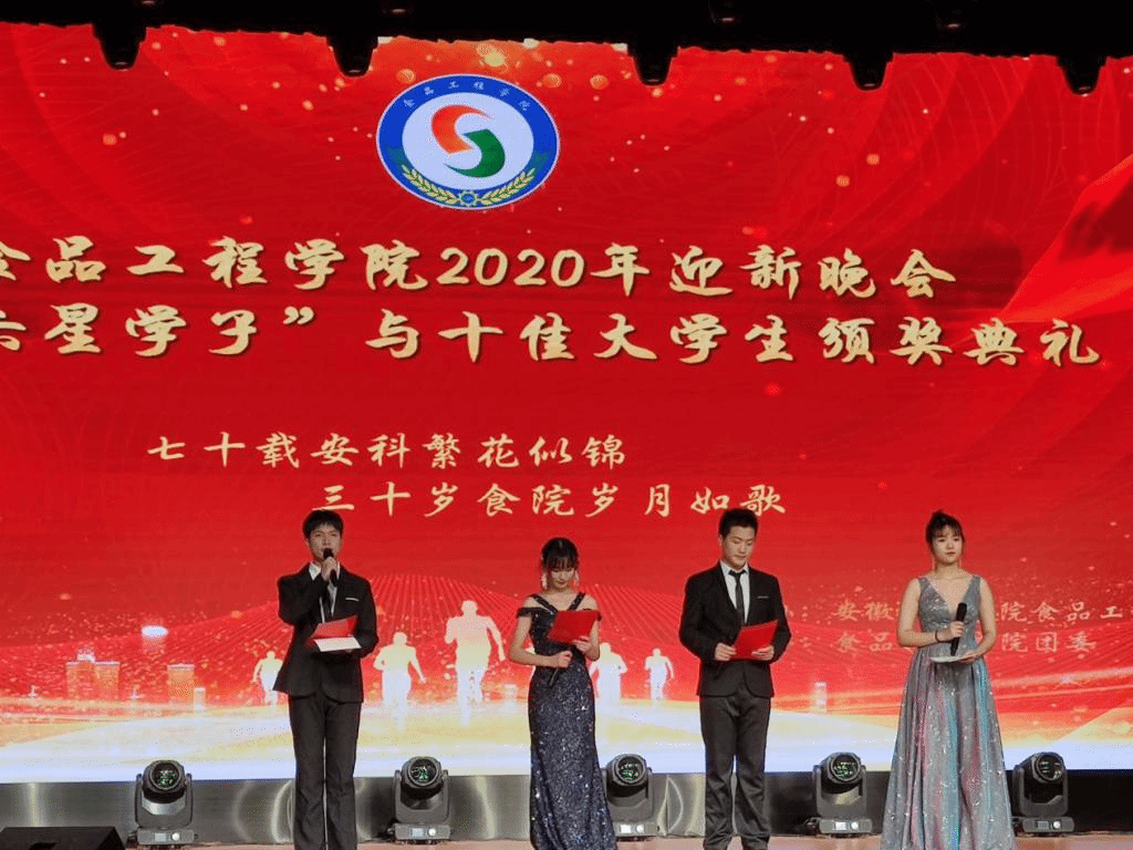 逢安徽科技学院建校七十周年,食品工程学院三十岁生日之际,食品工程学院2020年迎新晚会暨“六星”学子与十佳大学生颁奖典礼于12月6日晚在大学生活动中心隆重举行。此次迎新晚会经过长达一个多月的精心策划和筹备,得到了学院领导老师的高度重视和大力支持以及同学们的积极参与。晚会为学院老师、同学们搭建了一个师生联欢的舞台,将学院领导老师的关怀和温暖传递给每一位食品工程学院学子,整场晚会的节目编排设计也生动地诠释了食院一家人,食院一家亲的主题思想。