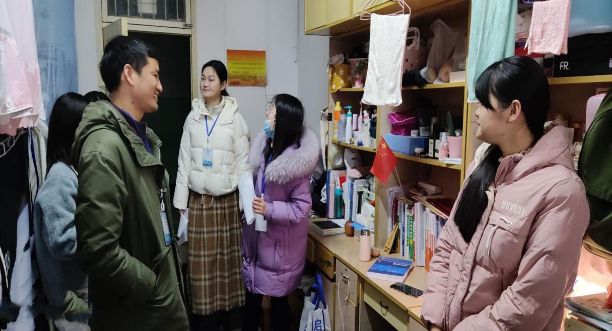 检查过程中,各小组根据事先分工,逐个宿舍进行检查,按照学院学生寝室检查评比办法,对值日安排、床铺、书桌、脸盆架、行李架、鞋架物品整洁情况进行细致认真地评分,对于一些可能存在的安全隐患,及时指出并提出整改措施。在检查宿舍安全卫生的同时,老师们还与学生进行了亲切的互动交谈,希望同学们和睦共处,互帮互助,建设团结友爱宿舍;要求大家严守防疫要求,养成良好生活习惯,保持清洁卫生坏境;叮嘱大家认真复习备考,严守考试纪律,为取得理想成绩而努力。(特约通讯员:时韩荣 审核:付光玺)