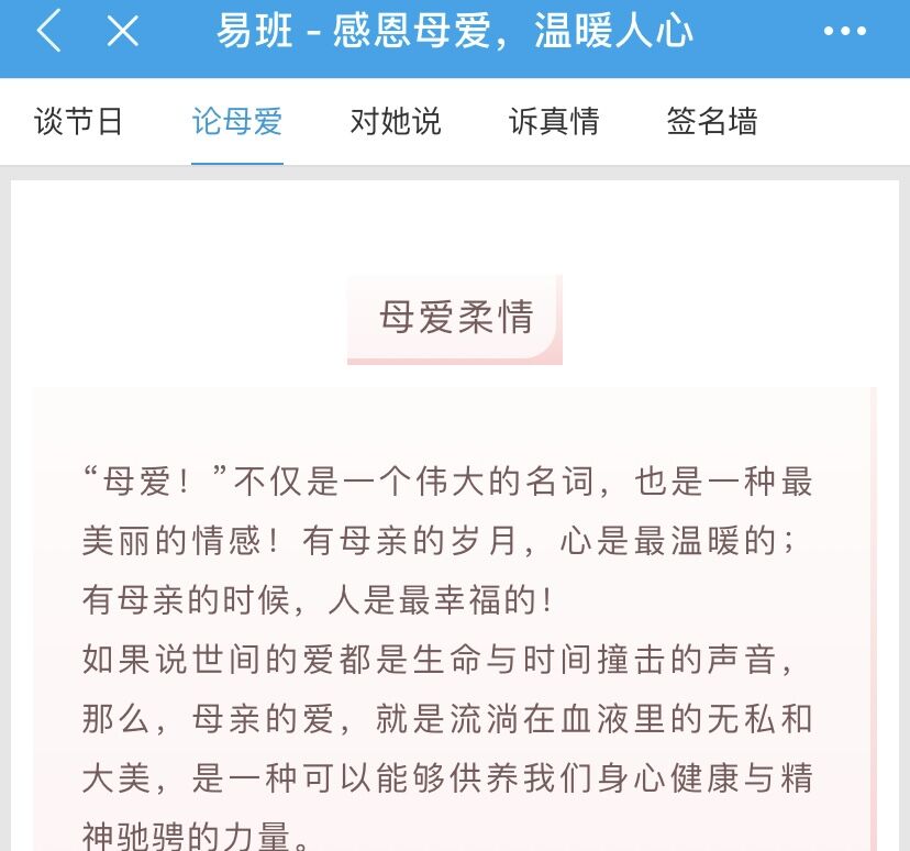 本次活动使用易班APP线上推出轻应用为同学们提供一个“我想对妈妈说”平台,同时在线下申请PU学时,同学们自行签到。在轻应用中同学们可以看到母亲节的由来、习俗、母亲节送妈妈的花朵合集以及母爱的意义等,让同学们在参与活动的同时回忆曾经和妈妈的点滴美好。爱,是产生一切动力的源泉,唯有母亲的爱,才是人类历史上最无私最无杂的情感和奉献。母亲是我们生命源泉的缔造者,也是我们美好生活的创造者。同学们积极踊跃地参与本次活动,用自身行动表达出了对母亲的爱。随着我们的成长,母亲会慢慢老去,所以在以后的生活中,相信同学们一定会抽时间多陪伴她,更加爱我们的母亲。