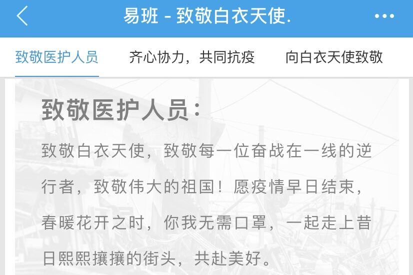 本次活动使用易班APP线上推出轻应用为同学们提供致敬平台,同时在线下申请PU学时签到。在轻应用中同学们可以看到在抗疫期间医护人员的艰辛、得知当下疫情发展状况以及国家对于当下疫情的应对措施。从防疫形势中让大家了解医护人员工作的困难以及他们坚持不懈的精神。哪有什么岁月静好,只是有人替你负重前行,他们是春天的雨露滋润患者的心田,是夏天的微风吹散患者身心的痛楚,是秋天的明月照亮患者走向健康的路,是冬日的暖阳温暖患者的心田。是爱的撒播者,不求名利、不求回报,一袭白素衣、一双纤纤手,一颗赤热心。同学们积极参与线上承诺书签署活动,用自身行动诠释当代大学生的对医护工作者的敬意。他们在如花的流年里,见惯了人世的悲欢离合,深谙生命之可贵。怀揣一个天使的梦想,青春不悔,岁月依旧。