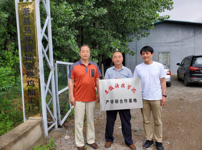 2021年6月3-4日,安徽科技学院与萧县孙家烧鸡加工厂产学研、校外实习实训基地签字和挂牌仪式在萧县孙烧鸡加工厂进行,萧县科技局刘纯扑副局长出席,中国畜产品加工研究会常务理事、安徽省家禽产业体系岗位专家、安徽科技学院食品工程学院李先保教授代表学院挂牌,食品工程学院吴晓伟副教授和甄宗圆博士同行。