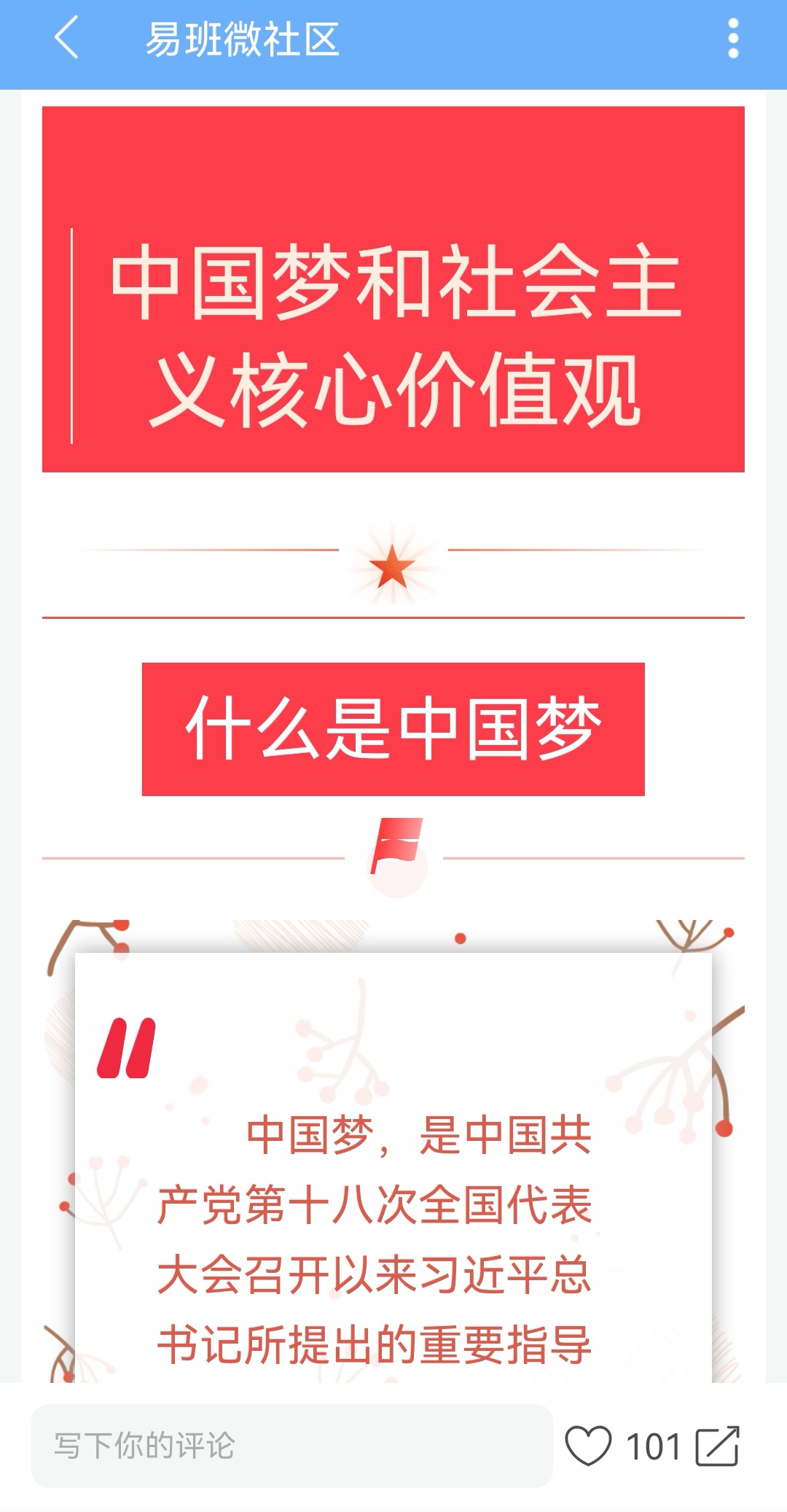 本次主题宣传教育活动利用易班线上进行。中国梦系列主题宣传教育活动,让同学们清晰的了解中国梦的意义,中国梦是国家的梦,民族的梦,也是每一个中国人的梦,只要每个人都把人生理想融入国家和民族的伟大梦想之中,敢于有梦,勇于追梦,勤于圆梦,就会汇聚成实现中国梦的强大力量。同学们积极参加线上打卡点赞,用自己的行动来抒发对祖国、家乡、生活的无限热爱与祝福。