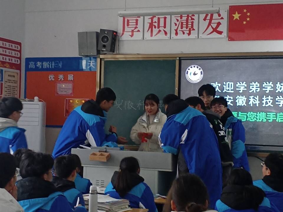 在交流会上,团队播放了安徽科技学院的宣传片,向同学们介绍了安科的历史渊源、教学环境、校园活动等,并向同学们详细介绍了安徽科技学院的办学条件、师资水平、招生就业、考研录取率等。随后,朱仪雯将安徽科技学院的纪念尺和自制的食品工程学院的小饼干分发给同学们。现场气氛活跃,同学们踊跃表达了自己的看法和期望。团队成员在分享自己大学经验的同时,注重鼓励同学们明确人生目标,增强学习热情,奋进争先,勇往直前。