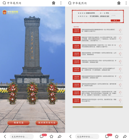 在各班级团支书的带领下,班级同学登录进入中华英烈网,通过在革命烈士纪念碑前献花、参观革命英烈纪念馆、陵园扫墓等形式进行网上祭扫。同学们还在“感言寄语”处写下对革命先烈、抗疫烈士等英雄人物的寄语,缅怀英烈,寄托哀思,表达崇敬感念之情。参与此次活动的许多同学们纷纷表示“因今年清明节疫情形势严峻,不能前往烈士陵园扫墓,但我们没有忘记革命先烈,在网上开展祭扫活动,文明祭祀,寄托哀思,深切追忆革命历史,感悟峥嵘岁月。我们要珍惜今天的幸福生活,刻苦学习,以革命先烈为榜样,争当信念坚定、勤奋上进、品德优良的新时代大学生。”