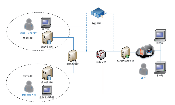 架构实现数据库服务器与业务系统服务器分离,并在数据读取交换过程中进行数据脱敏加密,防止数据泄露。依托数据脱敏系统可以实现生产环境与测试环境的分离,防止在新系统实施测试过程中的数据泄露,通过这种方式确保了用户的核心数据不泄露、不丢失、不篡改。通过旁路监听方式搭建数据库审计系统,不需改变现有网络结构,即可实现对核心数据的安全防护。架设专用无外网服务终端,使用专用加密传输介质进行数据上传、下载,确保数据传输安全。