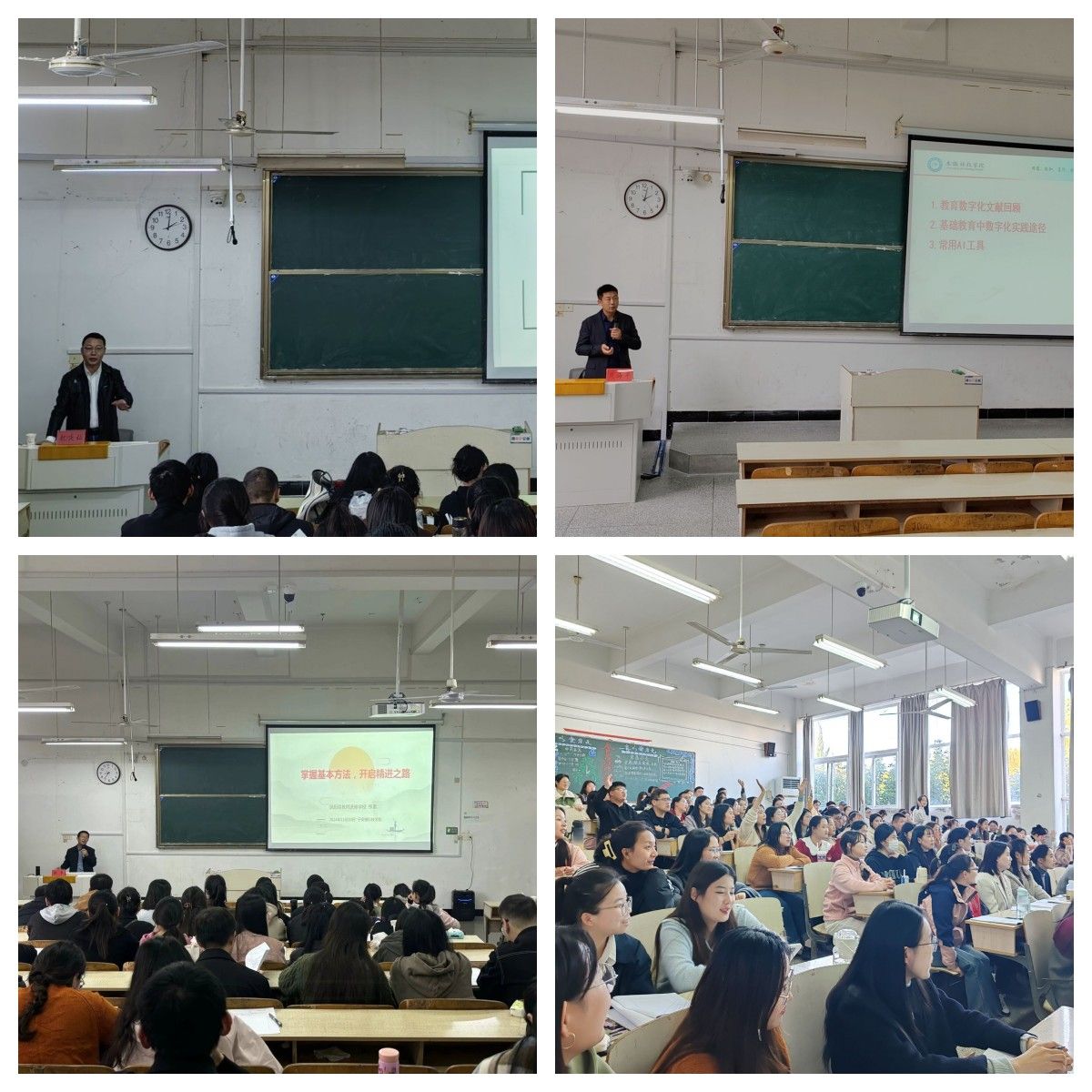 安徽科技学院副教授周海平围绕教育数字化与教师发展,分享了教育数字化相关研究、基础教育中数字化实践途径和常用的AI工具。凤阳县教师进修学校校长张雷强调教师应掌握备课、上课、听课、反思的基本方法,开启精进之路,尽快站稳讲台。安徽科技学院副教授赵庆灿强调教师应崇德修身,为人师表,做一名党和人民满意的好老师。凤阳县教育体育局教研室学前教育教研员赵雪莲主任开展了题为“新起点,新教研:幼儿园新教师教研探索”的专题讲座,围绕幼儿园教研的概念、园本教研的内容、优秀教研案例分享及县域教研的实施。