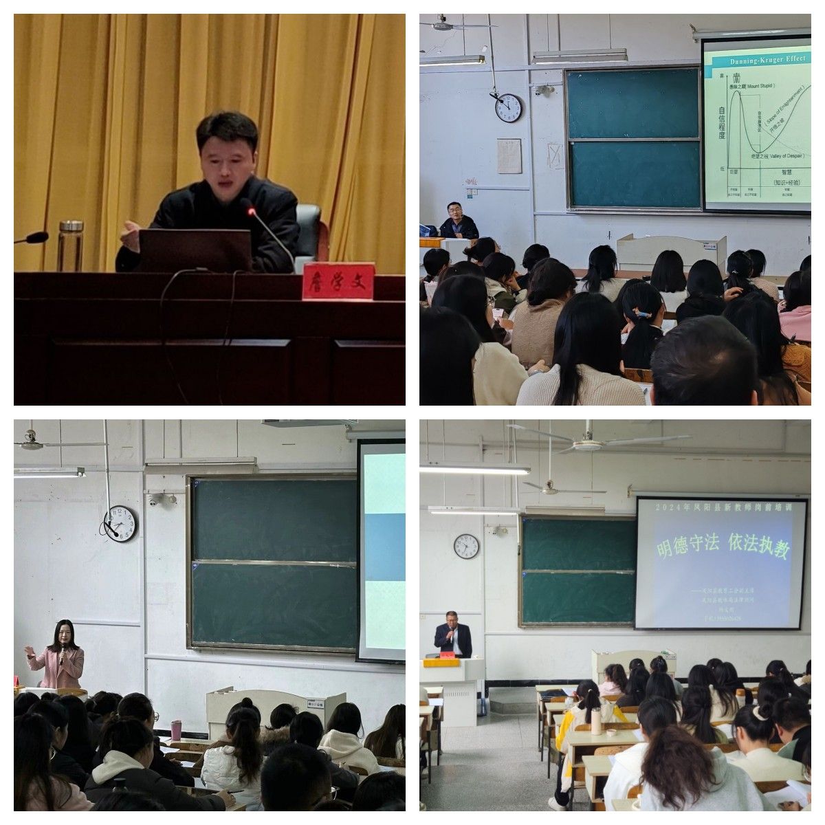 本次活动为125位新教师举办了11场专题讲座。安徽科技学院人事处处长詹学文的讲座以“新时代教师职业行为规范”为主题,强调要大力弘扬“教育家精神”,强化教师职业行为规范,不断提升教师职业水平。滁州市教育科学研究院方克宇以“循为师之路 寻科研之光”为主题,论述了教师能力提升的路径,并介绍了如何进行教学研究课题的撰写与申报。凤阳县教研室主任王金做了题为“走向专业化”的专题讲座,讲述了教师专业化的概念、教师专业化的六大法则以及教师专业标准。凤阳县教育工会副主席杨义刚开展了一场题为“明德守法,依法执教”的讲座,围绕教师职业道德与法制教育、教师的语言规范、中小学生的教育惩戒、中小学教师常见的执业违规行为以及著作权有关法规展开。