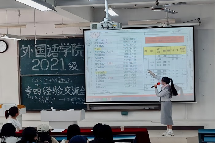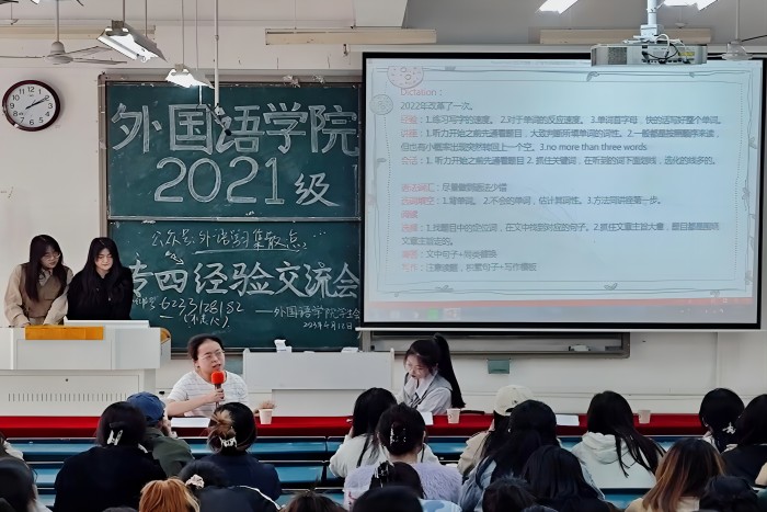 为让同学们深入了解英语专业四级考试相关信息,有效备考,外国语学院于4月12日下午在新知楼B座102教室举办英语专业四级考试经验交流会,学院专职辅导员张薇薇和2021级全体同学参加交流会。交流会由英语192班凤莎、翻译203班罗文玉和英语201班宋雨琪主讲,学院主持队杨雨甜主持。