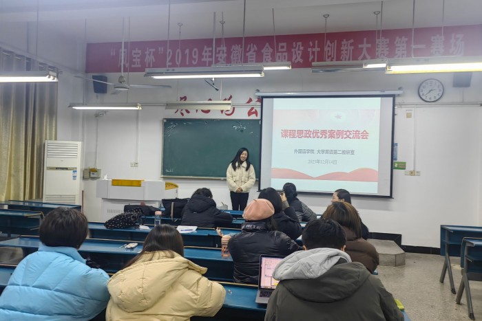 为了进一步推动实现全员全过程全方位育人,切实提高外语课程思政建设水平与实际效果,按照校院两级“课堂教学质量提升行动实施计划”及“质量文化月”安排,12月14日下午,外国语学院大学英语第二教研室在求知楼B105教室举办了课程思政优秀案例交流会。教研室全体教师参加了此次交流会,会议由大学英语第二教研室副主任刘蕾主持。