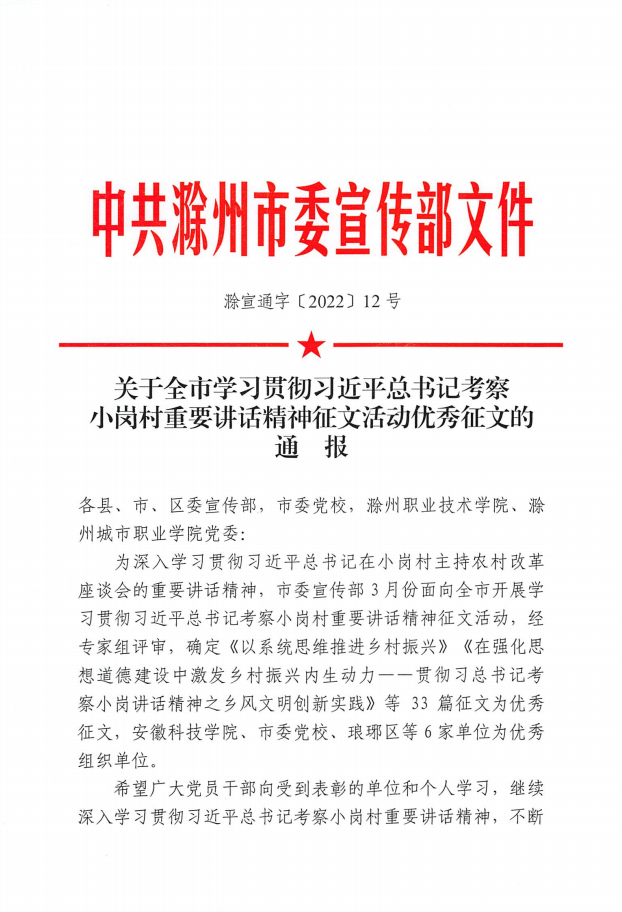 日前,滁州市委宣传部发布《中国足彩网全市学习贯彻习近平总书记考察小岗村重要讲话精神征文活动优秀征文的通报》(滁宣通字〔2022〕12号),我校在此次征文活动中荣获优秀组织奖(排名第一),四篇文章获评优秀征文。
