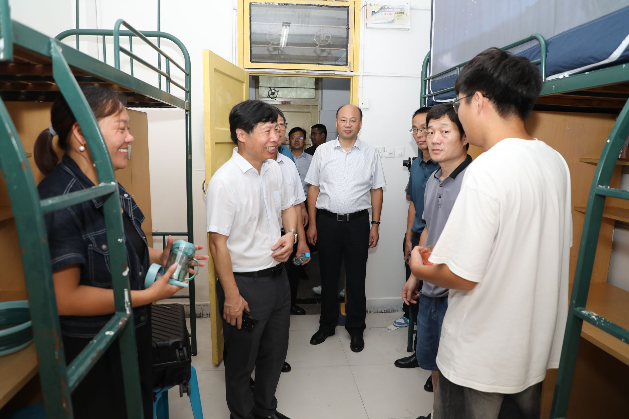 “老家是哪里的?”“乘坐什么交通工具来校的?”“食堂饭菜还吃得惯吗”“饭菜价格还合适吗?”……在实地了解新生入校情况后,校领导依次来到食堂、家长休息区、学生宿舍区等地与新生及家长亲切交谈,逐一解答了家长心中的疑惑,并勉励新生们自立自强,尽快转变角色,及早融入大学生活。