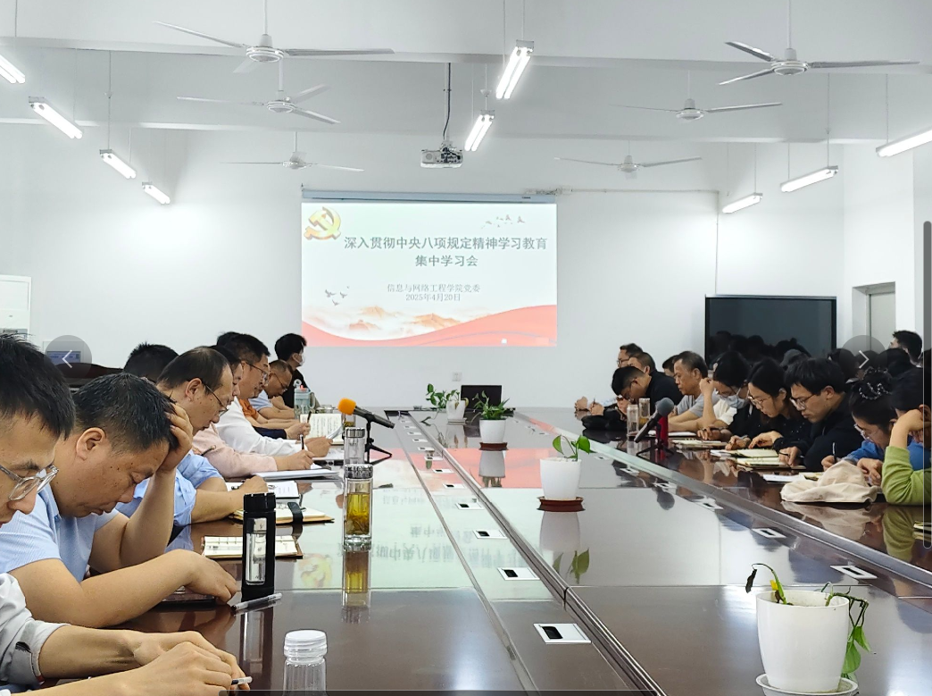 4月20日下午,信息与网络工程学院在尚行楼B418召开深入贯彻中央八项规定精神学习教育集中学习会。学院党政班子成员和全体师生党员参加了会议,会议由学院党委书记王振其主持。