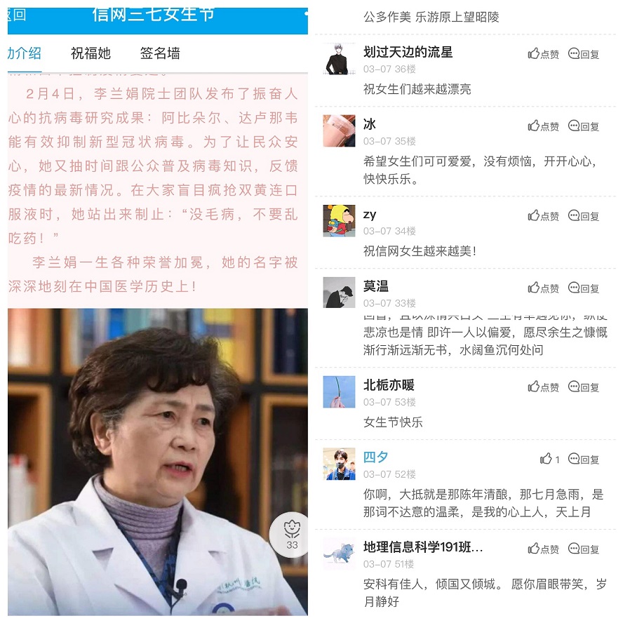 疫情期间,许许多多人奋战在疫情防控一线,这些人中不乏女性的身影,她们奉献自我,用自己的能量点亮一片片星空,温暖人心。期间,信网学子门也踊跃担当起家乡战“疫”的志愿者,积极参加志愿者服务工作。用汗水和努力守护家园。她们的身影出现在街头、村口的执勤点,对进出人员进行体温测量、安全排查、信息登记、行程劝返、宣传疫情防控知识等,她们用细心、爱心、信心为最终打赢疫情防控战贡献自己的一份力量。她们只是众多巾帼英雄的缩影,在疫情一线,有中国足彩网的“她”在奋斗,学院组织学生在易班平台线上为她们致敬,“云”上为她们祝福!