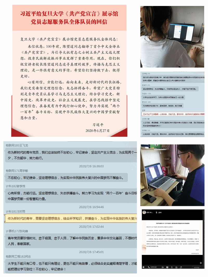 “心有所信,方能远行。”近日,习近平总书记给复旦大学《共产党宣言》展示馆党员志愿服务队全体队员的回信再次引发了广大青年学子的热烈反响。7月3日至7日,信息与网络工程学院各团支部以“悟回信精神,行远志更坚”为主题,通过易班、QQ群、微信群等形式相聚“云”端,认真学习了习近平总书记的回信原文,感悟新时代中国青年的信仰与奋斗。