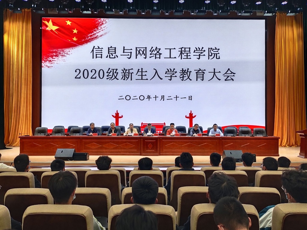 10月21日下午,信息与网络工程学院在龙湖校区东辅楼二楼学术报告厅隆重召开2020级新生入学教育大会。党总支书记王振其、副院长余宏杰、学院长助理何恩节及各系室主任、2020级新生辅导员及415名新生参加会议。会议由副处级辅导员韦乃学主持。